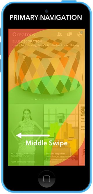 I could stay in the green zone, though, while preventing the Thumb Hook by swiping from the middle. But this isn't ideal. A middle-to-left swipe on the phone doesn't make use of Paper's exciting physics-driven carousel. I can barely get any inertia swiping from the middle. Even worse, my thumb covers up most of the content and I have to make a "dabbing" motion to see a steady stream of stories.