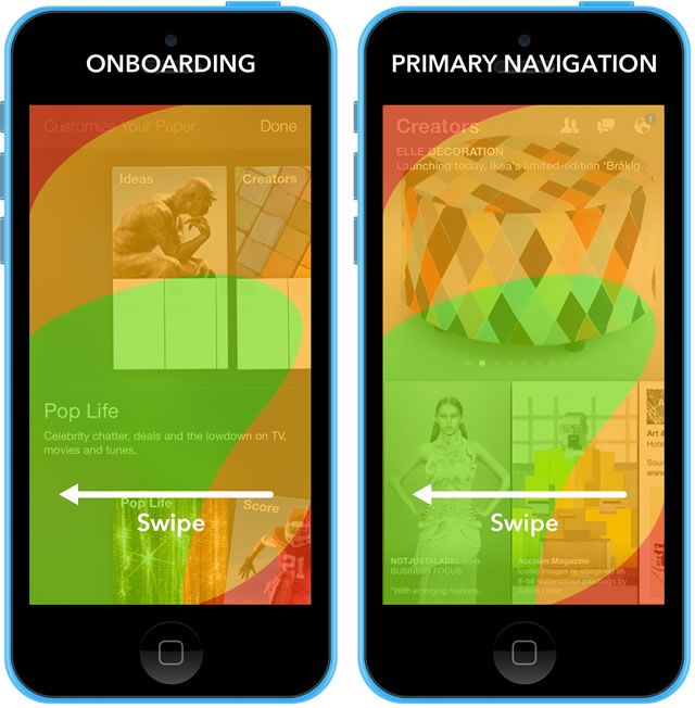 Now, let's look at Paper with overlaid Thumb Zones. Here, you're seeing the same problem within the onboarding step (choosing Topics) and the primary navigation (Topic to Read Story flow).