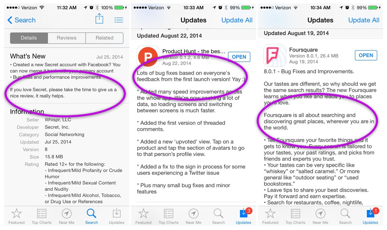 Switching gears, one important element that app makers frequently miss is the power of the "What's New" text you enter when you update your app. Even with iOS 7's background app updating, people still ready your update copy, both in the "Updates" tab in the App Store, and on your app's primary download screen