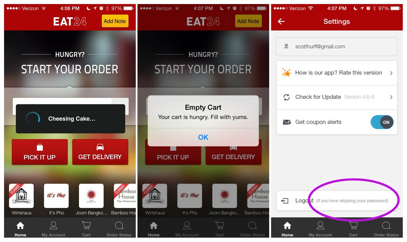 As we developed our voice, my model was Eat24. Everything I've read of theirs has a consistent tone — email, loading screens, error messages, etc. And in many cases, I've LOL'ed.